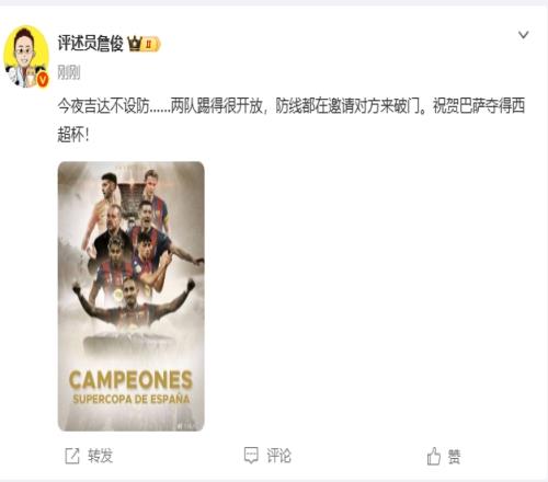体育播报01月12日宣 西超杯决赛,巴萨3-2击败皇马夺冠。赛后,评述员詹俊发文点评。